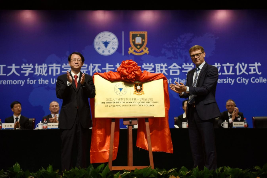 (2017年5月18日,新西兰UW学院成立仪式举行,新西兰高等教育、技能与就业部长Hon Paul Goldsmith与浙江大学校长吴朝晖共同为学院成立揭牌。)